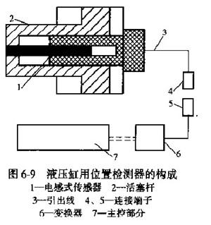 (1)直移式電感檢側(cè)器總體結(jié)構(gòu)這種直移式位置檢測器由電感傳感器、信號變換器及主控器等組成。如圖6-9所示,傳感器裝于活塞桿內(nèi)部,在惡劣的外部環(huán)境里,能通過液壓缸保護結(jié)構(gòu)精巧的傳感器,這是該檢測器最主要的特點,所以該檢測裝置特別適應用于如坑道挖掘、冶金鑄造、礦山開采、水下開采等工作環(huán)境十分惡劣的液壓機械設(shè)備上。