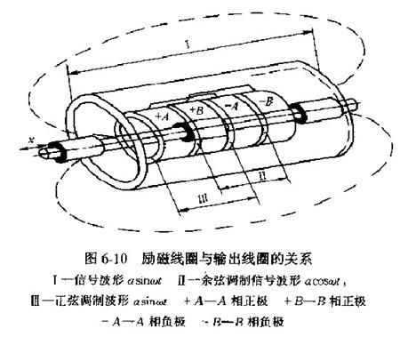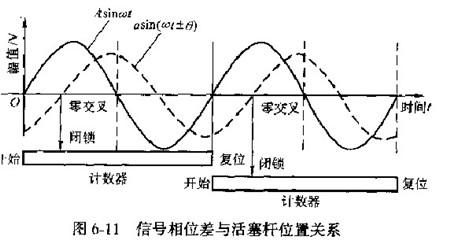 (2)檢測器的工作原理如圖6-9~圖6-11所示,傳感器的兩層感應線圈的一端與液壓缸底部相固定,另一端穿過液壓缸活塞進人到液壓缸活塞桿內(nèi)部。傳感器移動桿的內(nèi)部交替裝上磁性和非磁性材料,置于液壓缸活塞內(nèi)部與活塞桿相連。當液壓缸工作時,傳感器移動部分與感應線圈相對位置發(fā)生變化,傳感器的磁阻也發(fā)生改變,感應信號便與基準信號之間形成相位差、再經(jīng)相應的信號處理,即可得到液壓缸活桿的位移量。